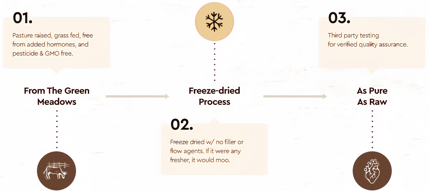 Our product is sourced from the most pristine grass-fed and grass-finished cattle, exclusively from New Zealand & Australia. In agricultural circles, it's known that the clean air, green pastures, and animal husbandry in this region is at the highest level.
