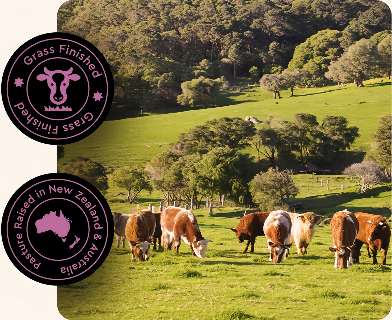 Our product is sourced from the most pristine grass-fed and grass-finished cattle, exclusively from New Zealand & Australia. In agricultural circles, it's known that the clean air, green pastures, and animal husbandry in this region is at the highest level.